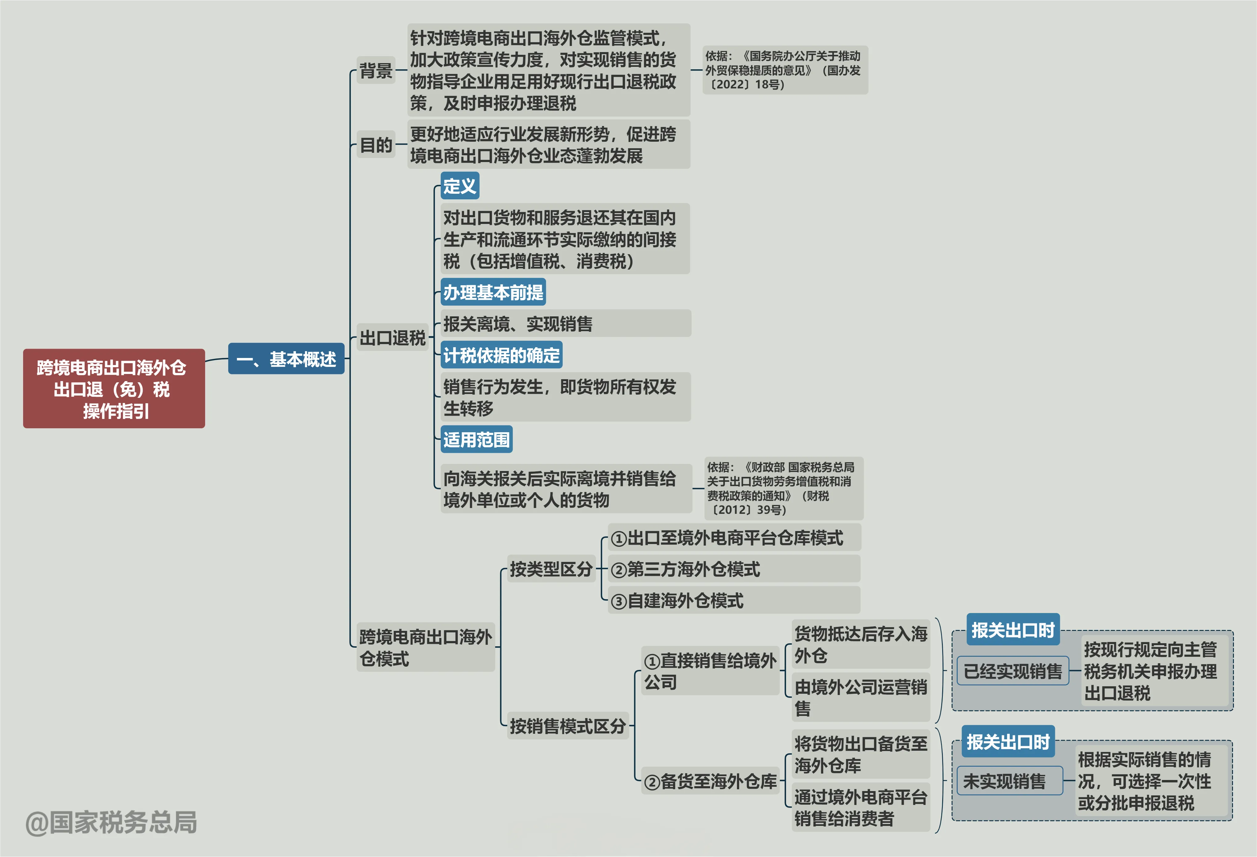 为帮助企业深入准确理解出口退(免)税政策规定,熟练掌握出口退(免)税业务办理操作流程,更好地适应行业发展新形势,国家税务总局近日发布《跨境电商出口海外仓出口退(免)税操作指引》,旨在为跨境电商出口海外仓企业提供详实办税指导。我们将指引内容梳理为思维导图。